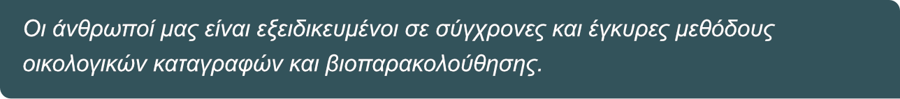 Οι ομάδα μας περιλαμβάνει βιολόγους, οικολόγους, περιβαλλοντολόγους και τεχνικούς με ειδικές γνώσεις στην καταγραφή, μελέτη και διαχείριση της βιοποικιλότητας.