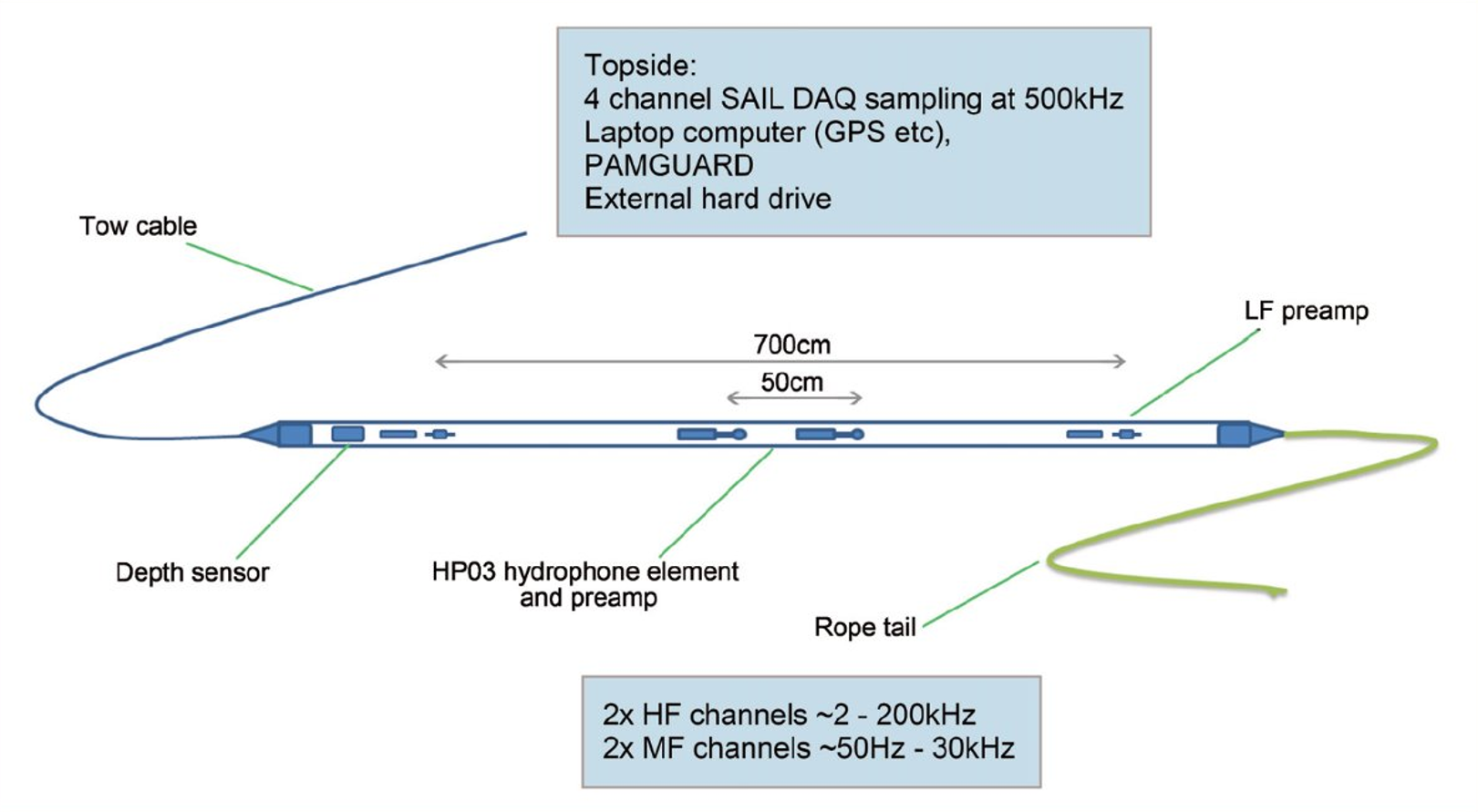 Passive acoustic monitoring (PAM) by hydrophones enables underwater acoustic recording over long periods of time at points of high interest.Acoustic monitoring is very crucial for recording cetaceans and underwater noise. It is applied in combination with the corresponding visual recordings and is carried out using electronic systems equipped with towed, moored, or drifting hydrophones.